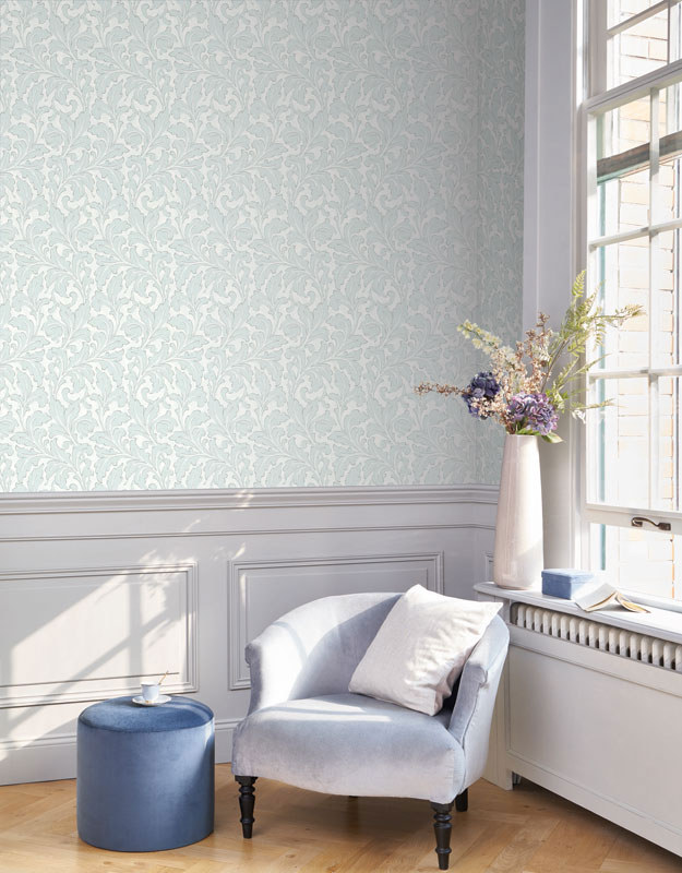 El papel pintado Acanthe, es un papel que destaca por la repetición de hojas grandes. Si te gustan este estilo de diseños, en nuestra página web, en la categoría ornamental podrás encontrar más diseños relacionados con esta temática. Este papel pintado también contiene acabados metalizados en las hojas.
