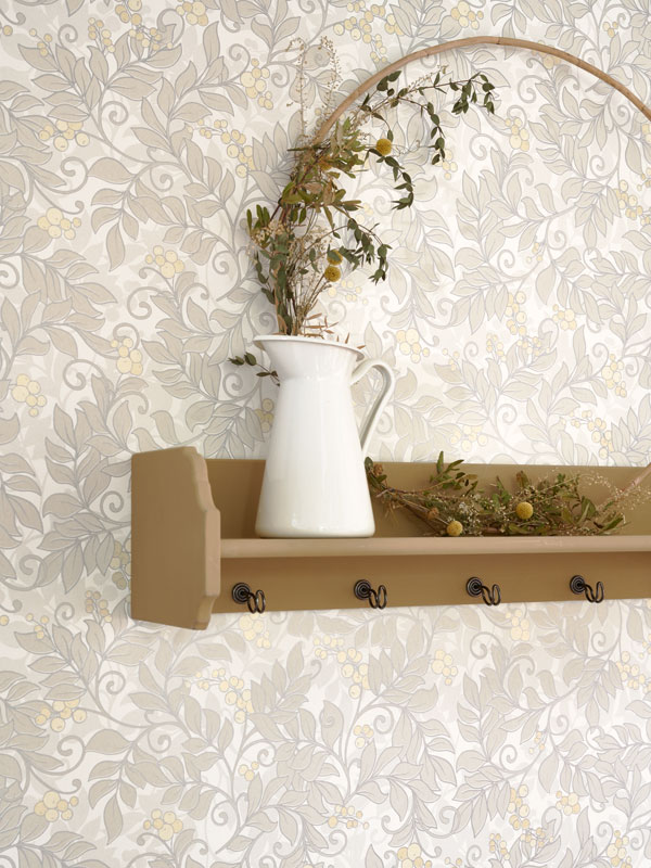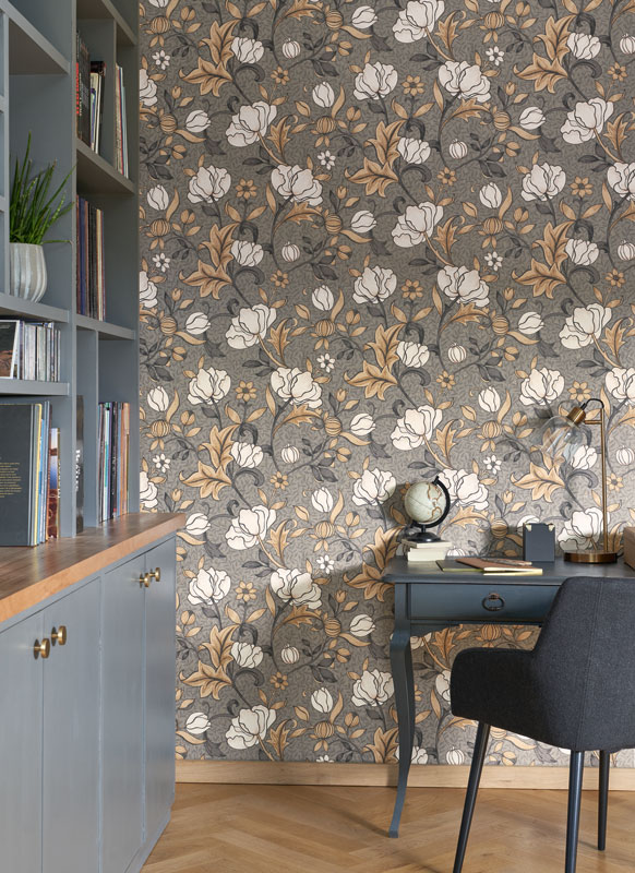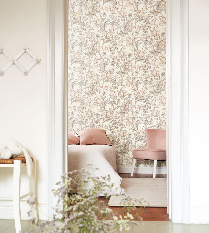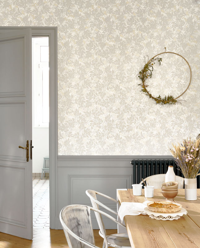 Archibald, es un papel pintado floral con ramas que creará en tu hogar un ambiente muy clásico y tranquilo, este también lo podrás encontrar en diferentes tonalidades nudes. Además, para que resalte mejor el diseño, este papel pintado contiene acabados metalizados en las hojas