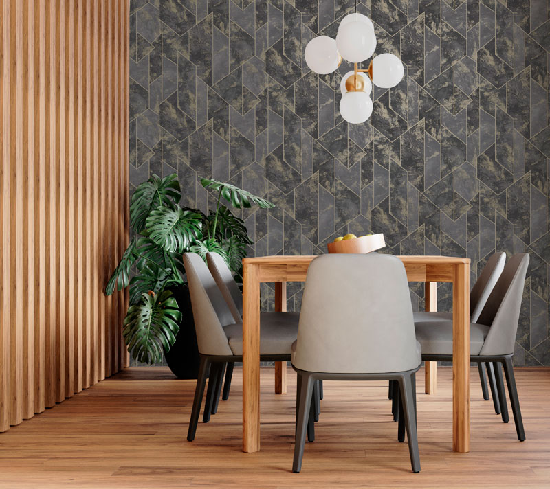 Continuando con el papel pintado geométrico, este es otro modelo pero en el diseño encontrarás elementos geométricos trapezoidales. Como el anterior modelo, este también es un papel pintado moderno y elegante que puedes escoger entre diferentes tonalidades. Además este papel pintado destaca por las líneas metalizadas que contiene.