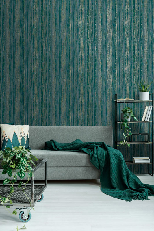 El papel pintado de textura desgastada contiene un diseño con imitación a madera que resalta por sus colores y por las líneas doradas metalizadas en vertical que contiene en el modelo. Este modelo lo encontrarás en cuatro tonalidades diferentes.