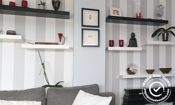 Otro modelo que quedaría fantástico en el salón es el siguiente papel pintado, el papel pintado con rayas, este diseño es algo más tradicional y simple. Con este papel pintado a rayas horizontales conseguirás un efecto de amplitud y más altura en las paredes. En concreto, este modelo lo encontrarás como papel pintado rayas 902.