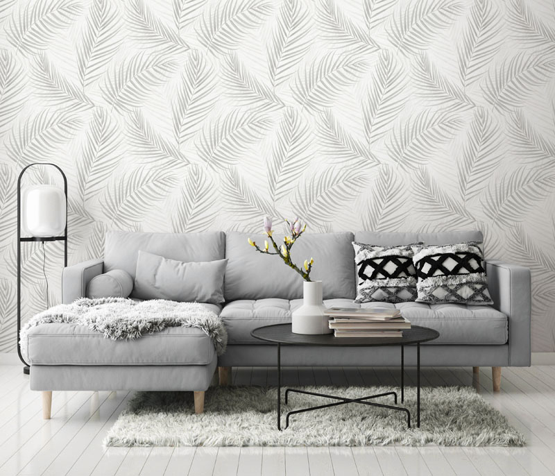 Pues bien, si quieres obtener una decoración más primaveral, fresca e iluminada te proponemos el papel pintado con hojas tropicales, este hará de tu estancia un ambiente relajado y veraniego. Podrás ver este modelo en diferentes tonalidades, por ejemplo, en beige, turquesa oscuro, gris, negro, etc.