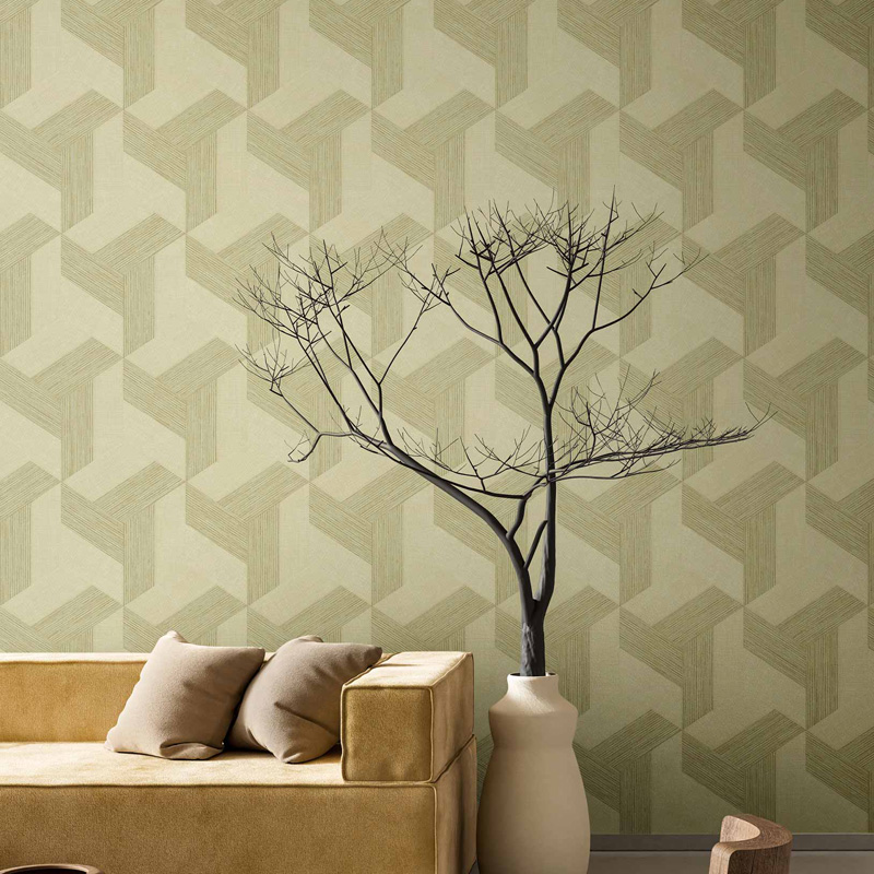 El papel pintado de patrones geométricos en tonos tierra y verde suave, como el de la imagen, transforma cualquier espacio en un entorno equilibrado, contemporáneo y lleno de calidez. Su diseño aporta ritmo visual sin saturar, lo que lo hace ideal para destacar una pared en salones, estudios o zonas de descanso.