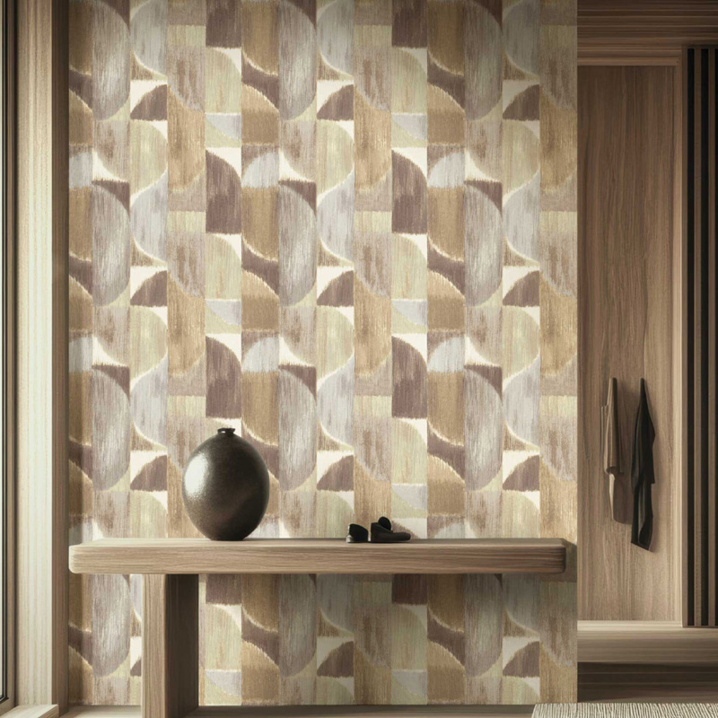Seguimos con el Top 5 un papel pintado que aporta un carácter más artístico y contemporáneo que rompe la simetría clásica y da paso a un juego visual cautivador. Este papel pintado de la colección Sintesi destaca por su patrón geométrico con formas curvas y rectas entrelazadas, en una paleta que mezcla beige, tierra, crema y toques de gris humo.
