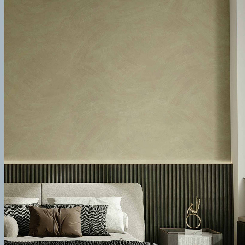 Si observamos con atención el contraste que ofrece este papel pintado, notamos cómo su tonalidad tierra suave, combinada con un sutil efecto estuco veneciano, crea una base elegante y acogedora. Este acabado, lejos de ser plano, aporta profundidad visual gracias a sus matices difuminados que recuerdan a una pared trabajada artesanalmente.