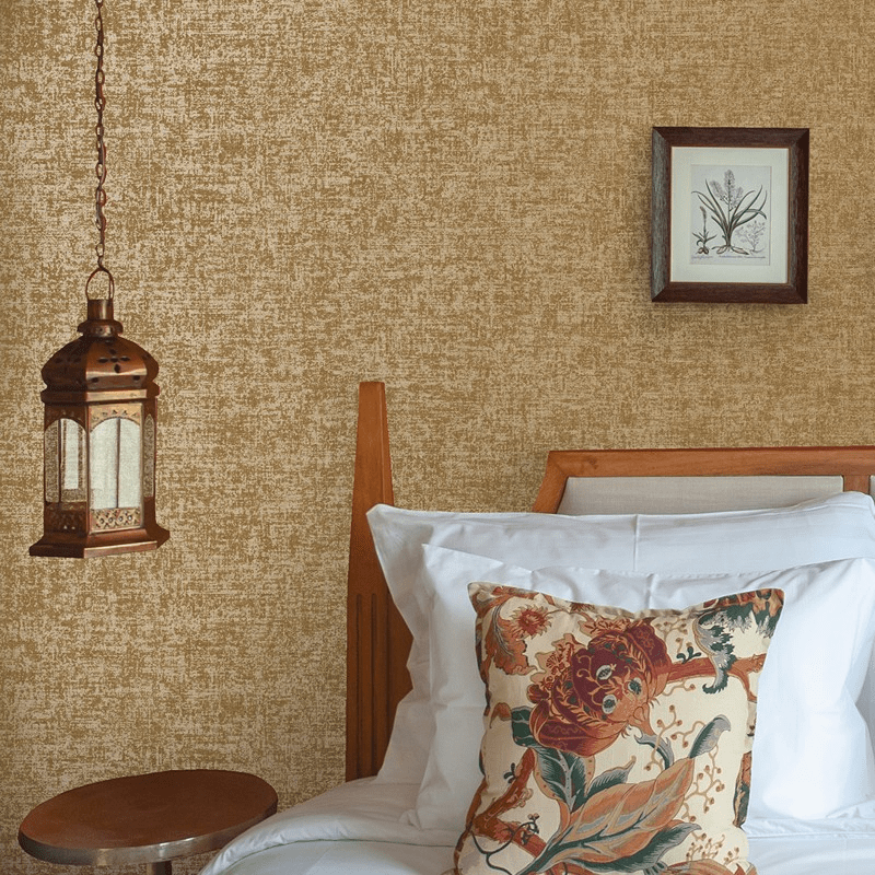 Papel pintado efecto envejecido de color cobre, diseño inspirado en las Cuevas de Ajanta, sutil y elegante.