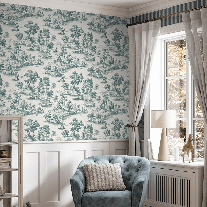 Este papel pintado Toile de Jouy en color verde, es una reinterpretación elegante de uno de los estilos decorativos más icónicos de la historia del interiorismo. Inspirado en el clásico diseño Toile de Jouy, este modelo presenta delicadas escenas ilustradas con paisajes, arquitectura y personajes que evocan la estética artística europea del siglo XVIII, aportando profundidad visual y un carácter narrativo único a las paredes.